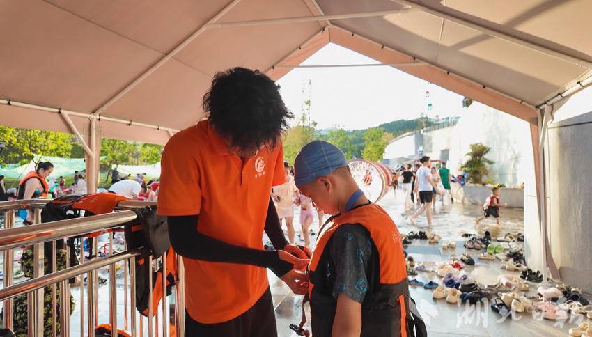 城溪水上乐园安全员王志远说:“今天有700多人来游玩,我们会提醒小孩穿上救生衣,10名救生员也会不间断地巡查。”