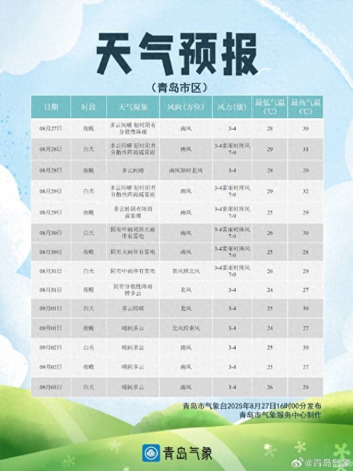 【青岛市区】今天夜间,多云间晴,短时阴有阵雨,南风3到4级,明天白天,多云间晴,短时阴有分散性阵雨或雷雨,南风3到4级雷雨时阵风7到9级,相对湿度75%-90%,明天最低气温28℃,最高气温31℃。28日夜间到29日白天:多云间晴,短时阴有分散性阵雨或雷雨,南风短时北风3到4级雷雨时阵风7到9级,28到32℃。29日夜间到30日白天:多云转阴有中雨局部大雨伴有雷电,南风3到4级,雷雨时阵风7到9级,25到30℃。